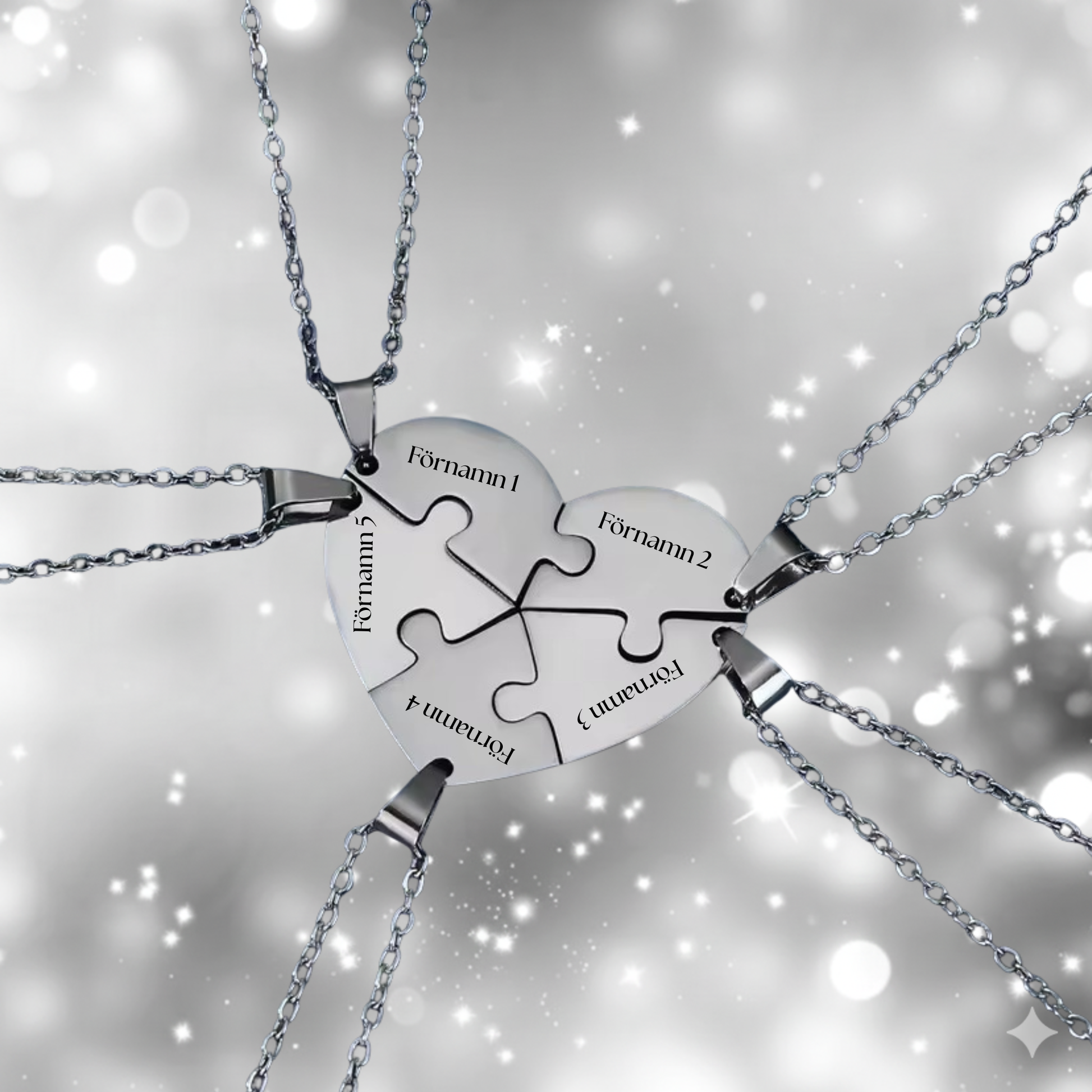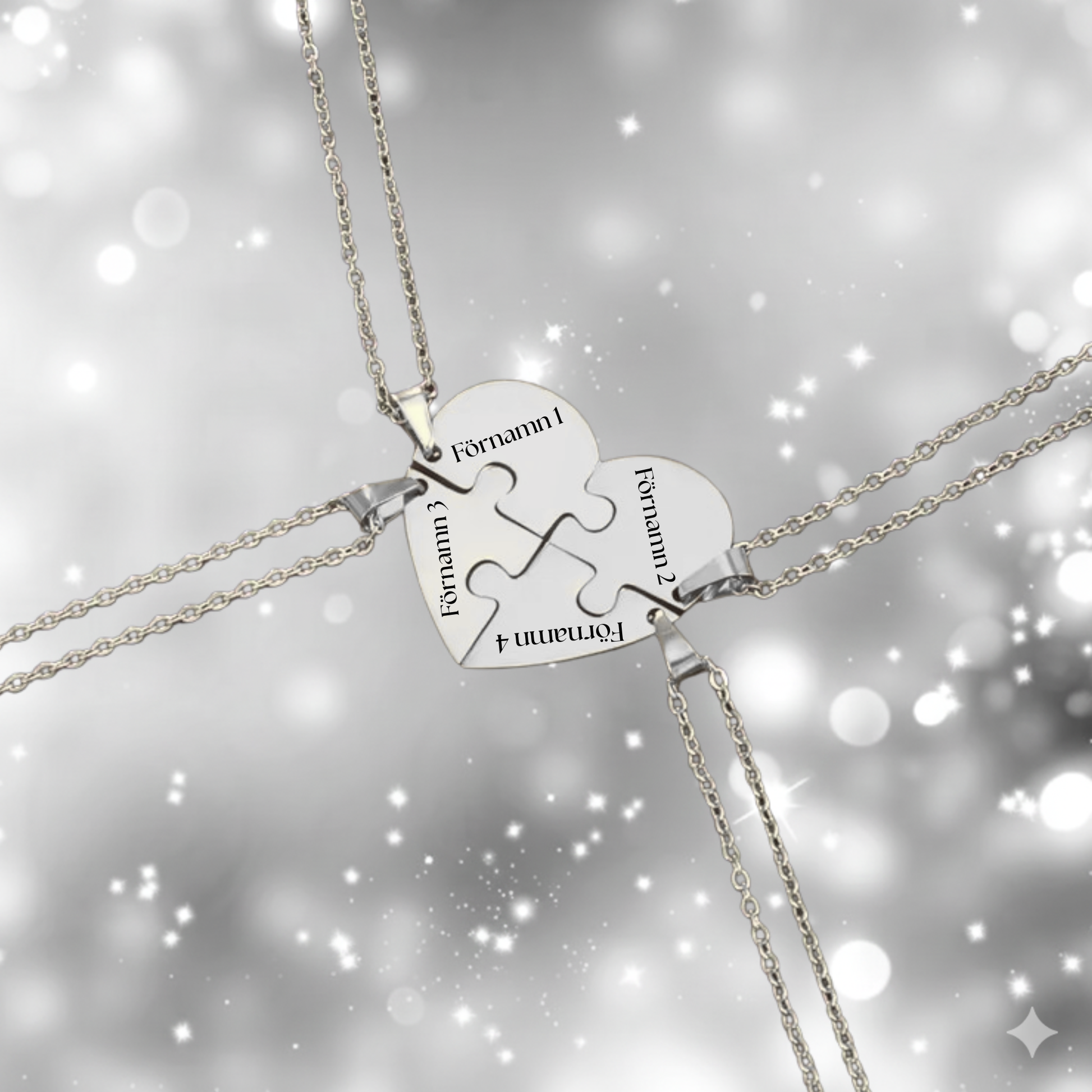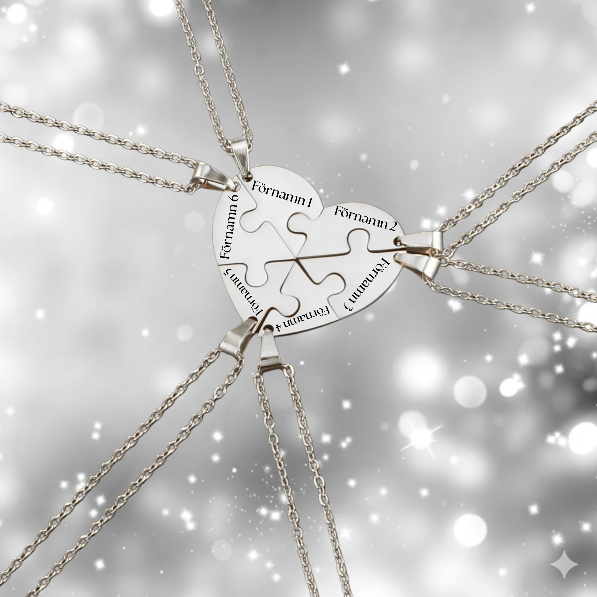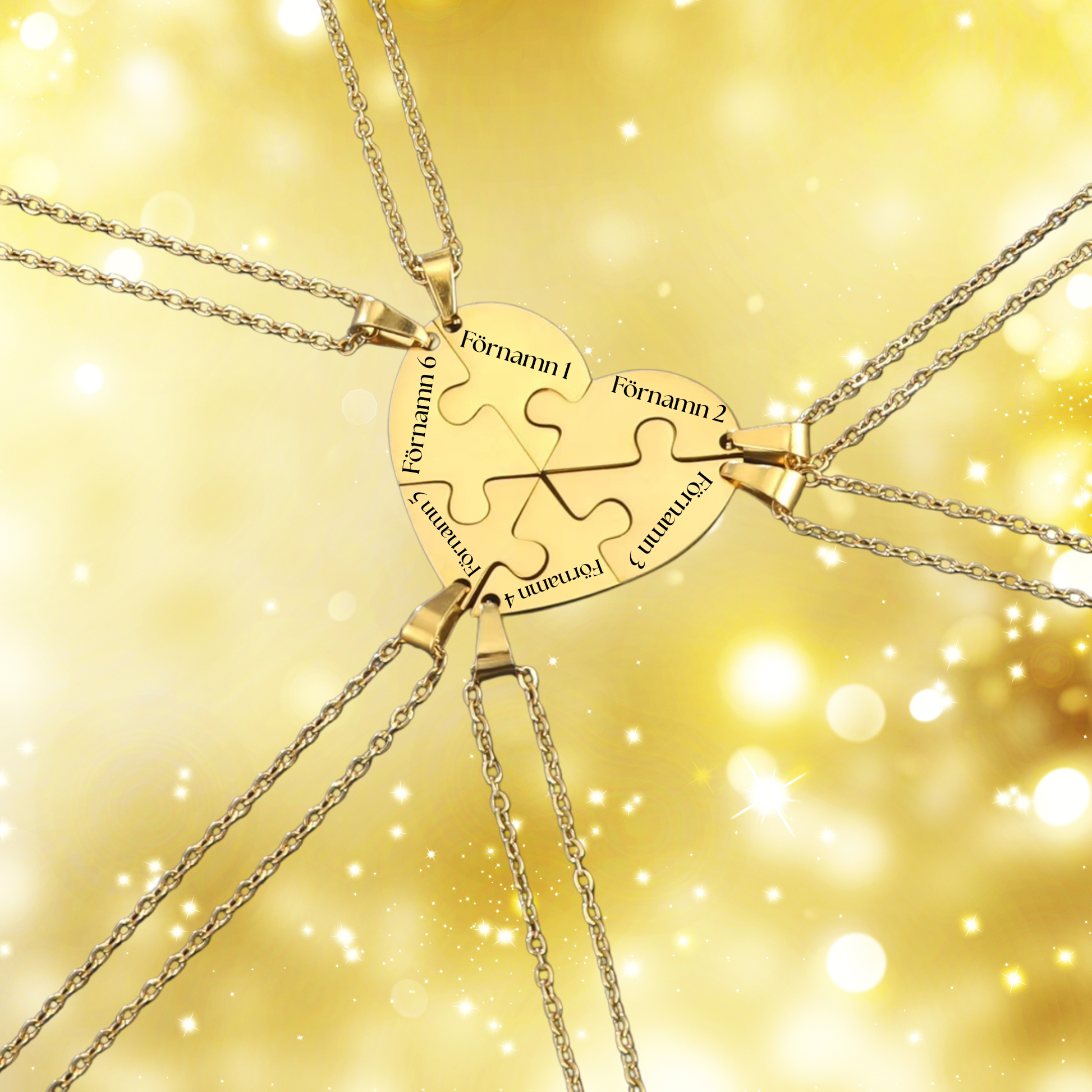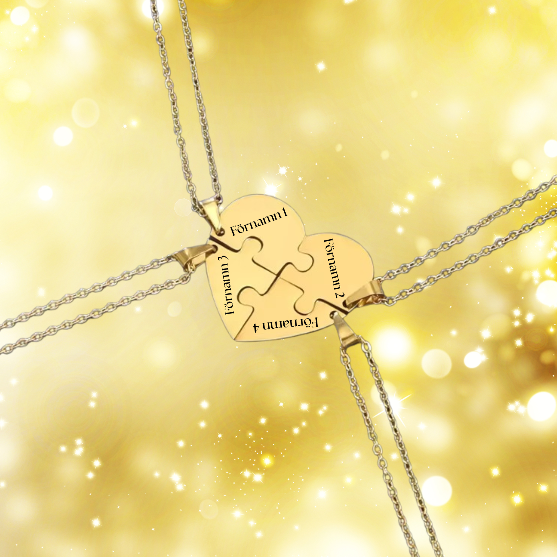 Med vårt handgjorda halsband representerar varje pusselbit en älskad person. Varsamt graverad för att symbolisera ett unikt, djupt och oförstörbart band.